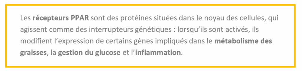 Ses bienfaits sont dus à sa capacité d’activer les chefs d’orchestre du métabolisme que sont les récepteurs PPAR ou N1C1.